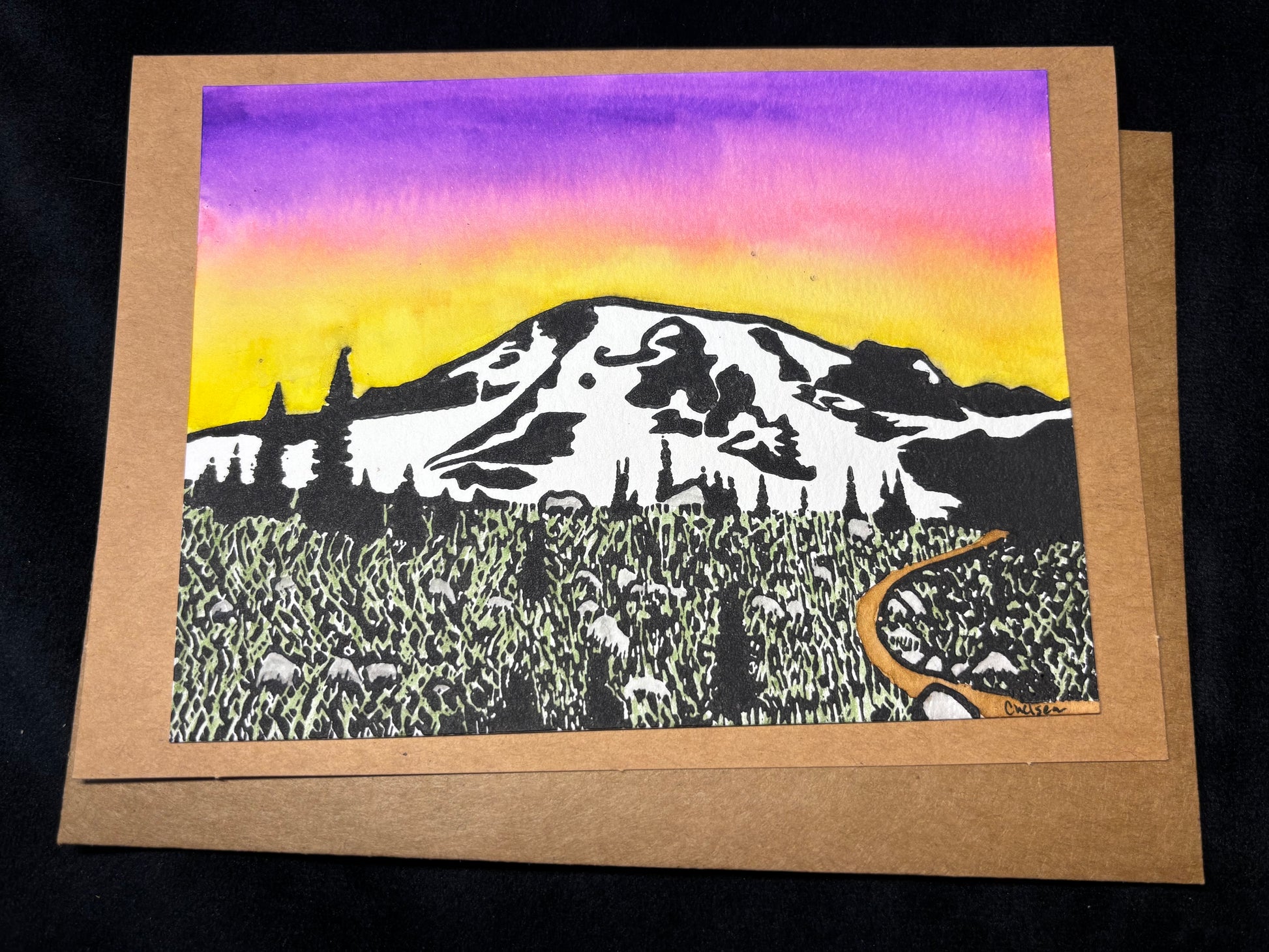 Hand carved, printed, and painted 5x7 inch greeting card with envelope.